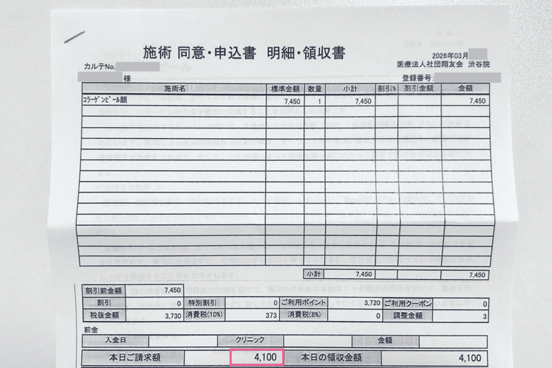 私は品川美容外科の独自ポイントであるBMCポイントを持っていたので、最大利用分である税抜きの半額分をポイント利用し、お会計は4,100円でした。