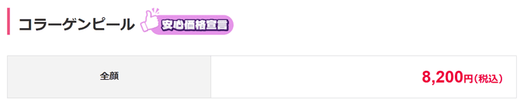| コラーゲンピール(全顔) | 8,200円〜 ※友達紹介割で半額4,100円 | ほぼなし | 約15〜20分 |