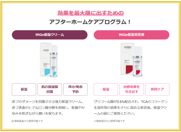 また、施術後のホームケアとして、コラーゲンピールとの併用利用が推奨されている「WiQo(保湿クリーム・美容液)」も購入できます。