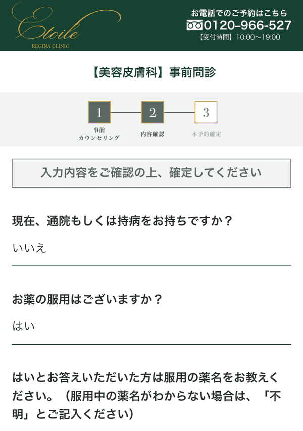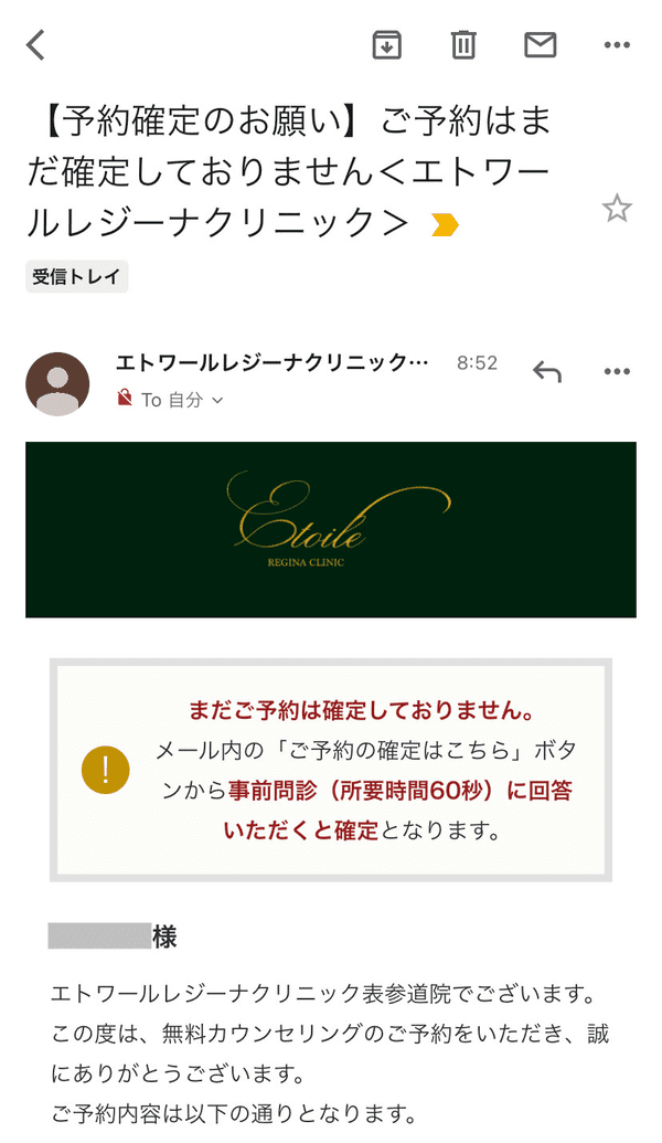 なお、予約日の前日にエトワールレジーナクリニック(0120-886-885)から確認の電話がかかってきます。