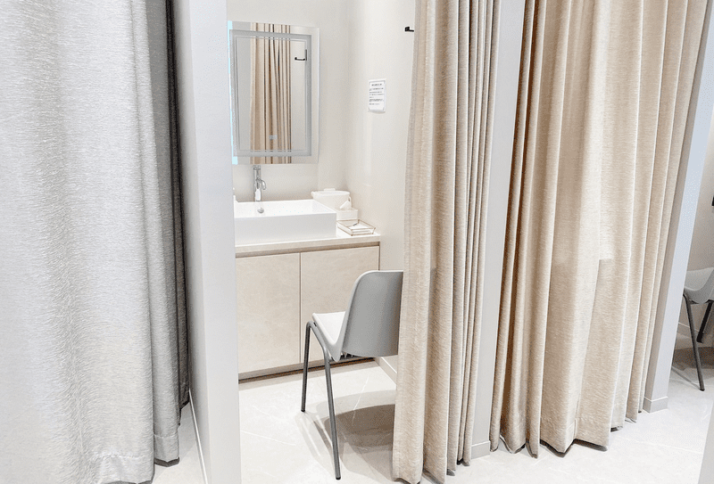 まずは、カーテンで仕切られた個室のブースでメイクや汚れを落とします。