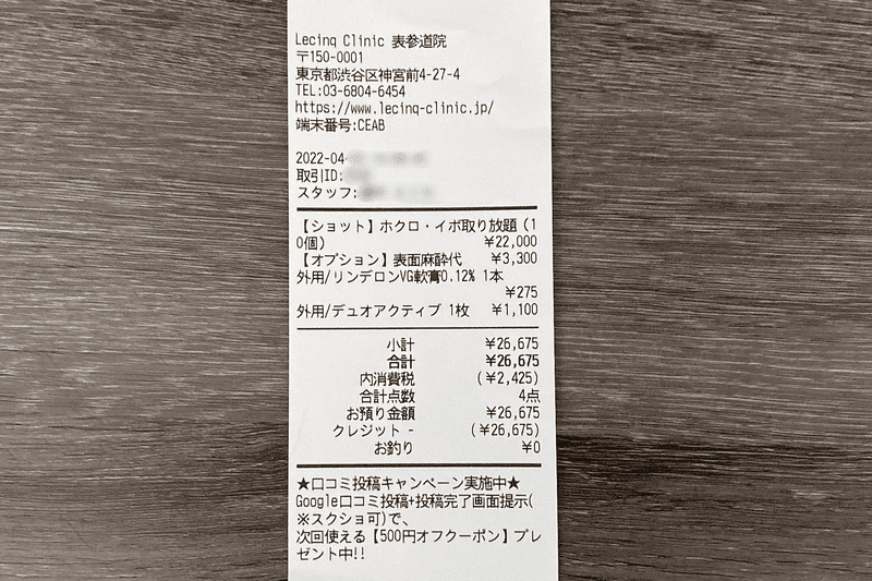 他クリニックの軟膏代やテープ代同じくらいの価格なので、診察料と麻酔注射料が施術代に含まれている分、ルサンクは良心的かなと感じました。