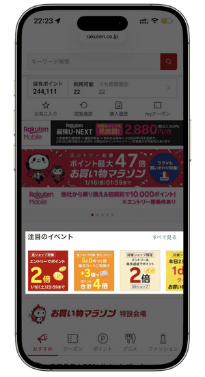 クーポン、楽天DEAL、Rakuten Fashion独自のポイントUPキャンペーン、アプリからの購入を駆使することで、とんでもない量のポイントを獲得できます。