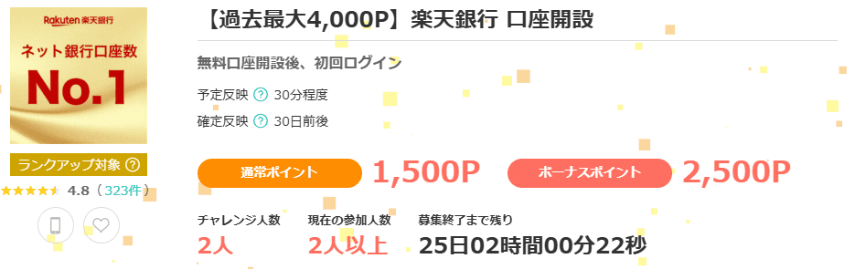 無料で銀行口座を作るだけで1,500円もらえ、楽天カードでもらえるポイントも合わせると、この時点で20,000円分のポイントをGETできる計算に。