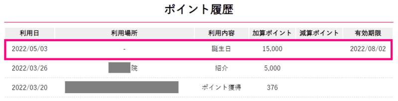 お誕生日のタイミングで必ずポイントが付与されているので、お誕生日が近い方はポイントの利用期限が切れる前に使うのを忘れずに!