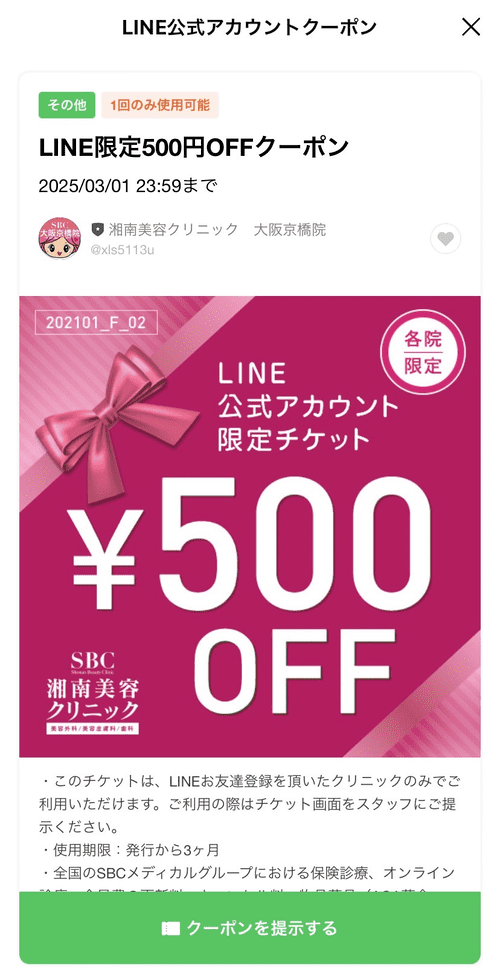 湘南美容クリニックは院ごとの公式LINEも開設されており、登録すると院限定500円OFFクーポンがもらえます✨
